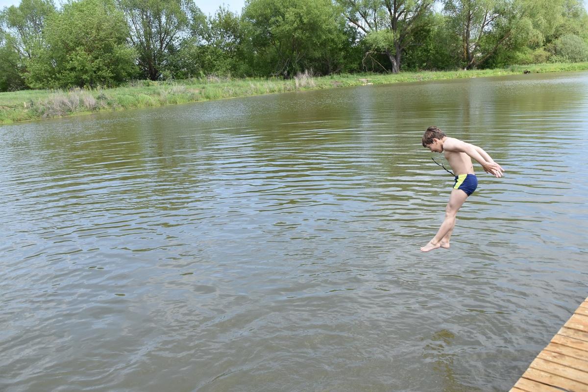 Вот и сегодня, 3 июня, на пляже много мальчишек и девчонок, которые плавают в пруду и отдыхают на пирсе. Пирс построили несколько лет назад по региональной программе поддержки местных инициатив.