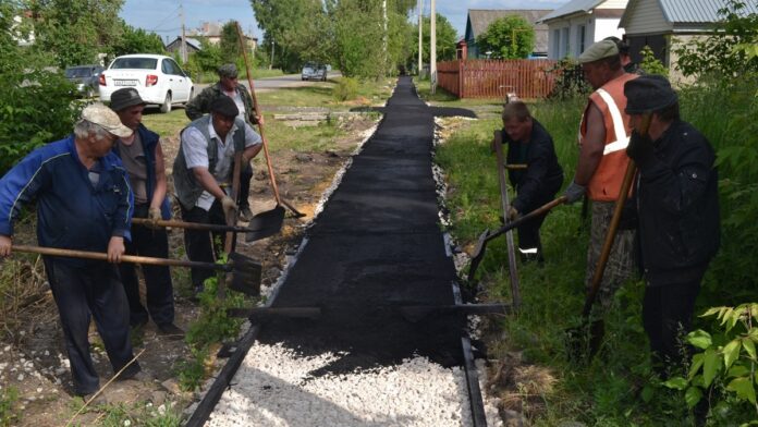 На улице Чкалова в Пителине строят новый тротуар. 16 июня закончили укладывать асфальт. Теперь рабочие подсыпают землю по краям дорожек.