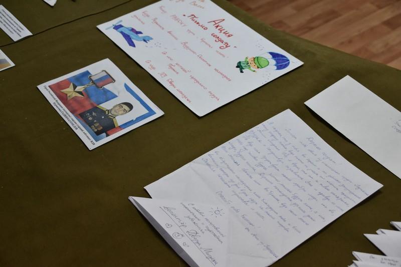 Отдельный экспонат выставки – детские письма поддержки военнослужащим, выполняющим задачи специальной военной операции на территории Украины. Эти письма написали в ходе акции «Письмо солдату».