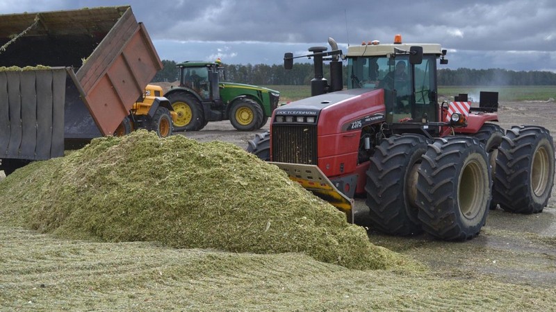 На кормовом дворе, где расположена площадка для приготовления силоса, также в две смены работают четыре единицы техники: два трактора с отвалами и два с катками для трамбовки поступающей с поля «зеленки». Комбайны в поле обслуживает транспортное звено. Восемь грузовиков с прицепами позволяют не простаивать комбайнам и лишней минуты. Водители, как и механизаторы, работают в две смены.