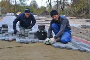 На прошлой неделе начались активные работы по укладке брусчатки в два цвета площадью 527 квадратных метров. Этим делом у нас занимаются Нематжон Насирдинов с Сергеем Завьяловым и Акром Хусанов.