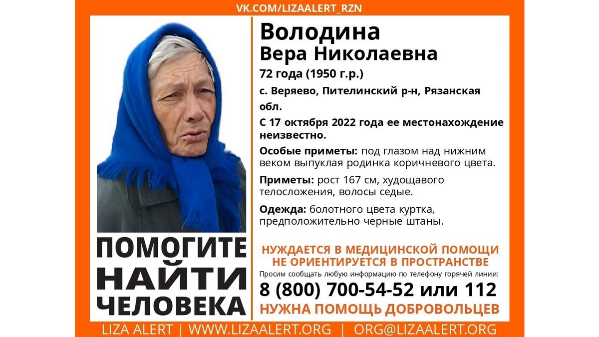 В Пителинском районе ищут 72-летнюю жительницу села Веряево. Вера Николаевна Володина ушла из дома 17 октября. С тех пор ее местонахождение неизвестно. Об этом сообщает поисковый отряд Рязанской области «ЛизаАлерт».