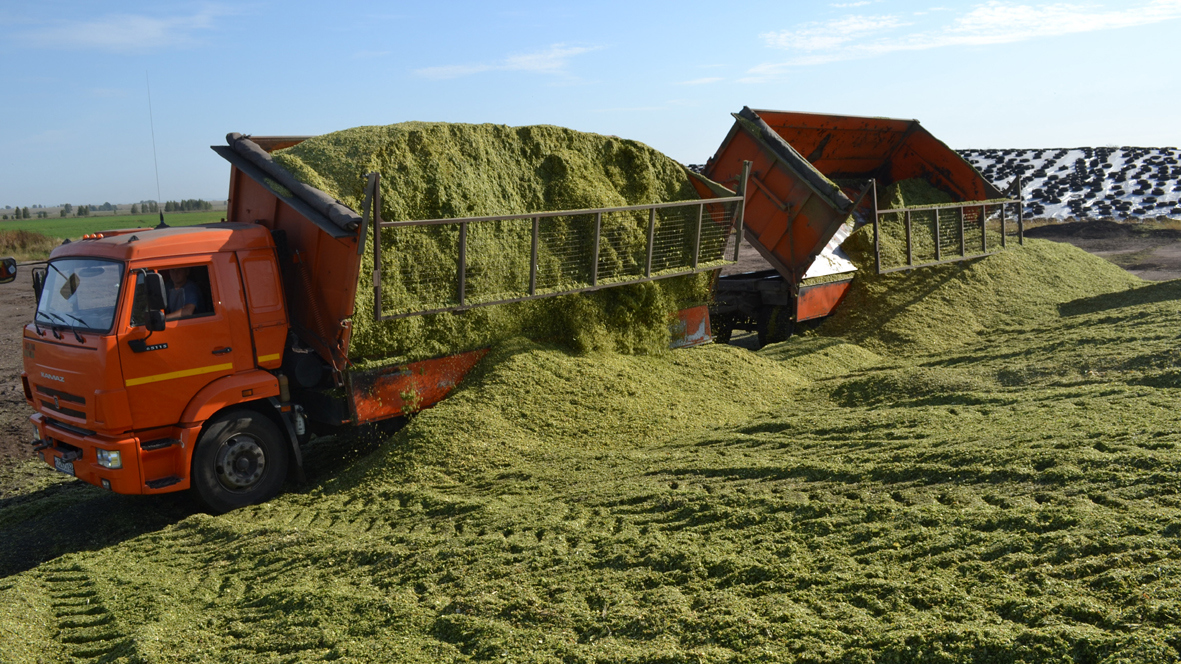 Обслуживает комбайны транспортное звено из восьми машин. КамАЗы с прицепами доставляют зеленую массу от комбайнов на кормовой двор к кургану. Здесь на трамбовке поступающей с поля зеленки работают четыре трактора различных марок».