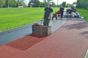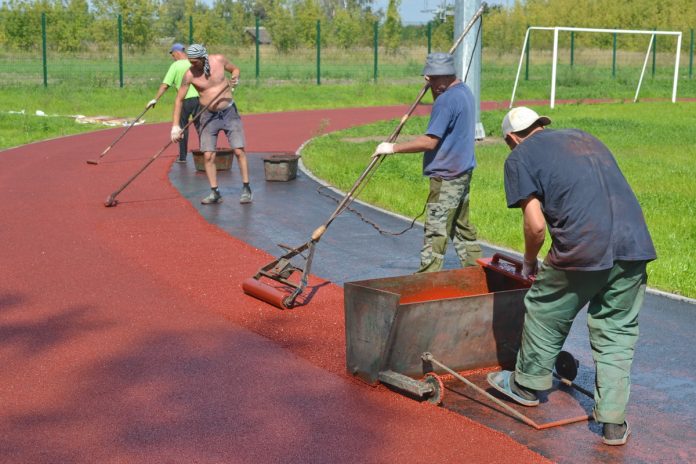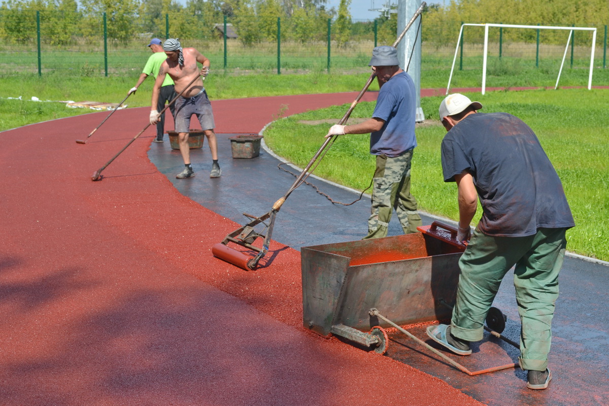 27 августа рабочие и специалисты ООО «ЭкоПорт Плюс» из Рязани укладывали бесшовное покрытие беговых дорожек на спортплощадке стадиона рабочего поселка Пителино.