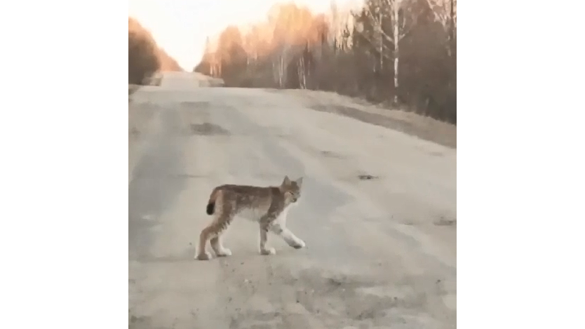 Рысь, гулявшую по проселочной дороге, снял на камеру водитель из Сасова.