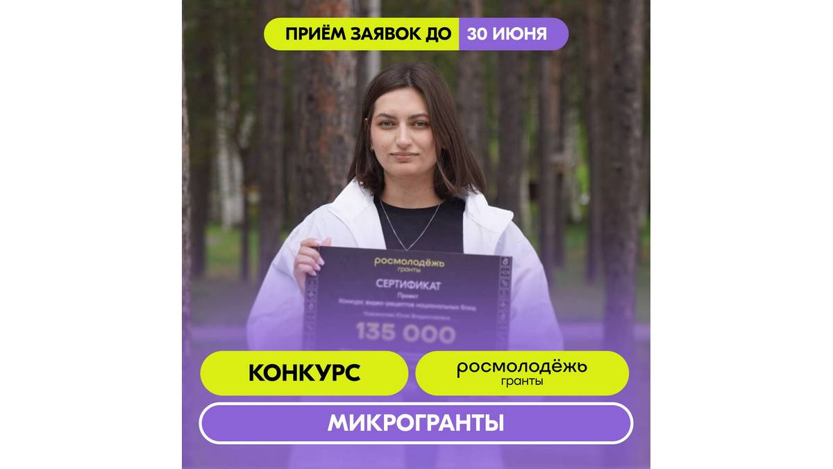 1 июня 2025 года стартует Всероссийский конкурс молодежных проектов среди физических лиц «Росмолодежь.Гранты: Микрогранты». Конкурс проводится в рамках федерального проекта «Россия — страна возможностей» национального проекта «Молодежь и дети» и направлен на поддержку инициатив молодых граждан, вовлечение молодежи в активную социальную практику, развитие творческих способностей и повышение гражданской активности. К участию приглашаются граждане Российской Федерации, а также лица, постоянно проживающие на территориях Донецкой и Луганской Народных Республик, в возрасте от 14 до 35 лет включительно.