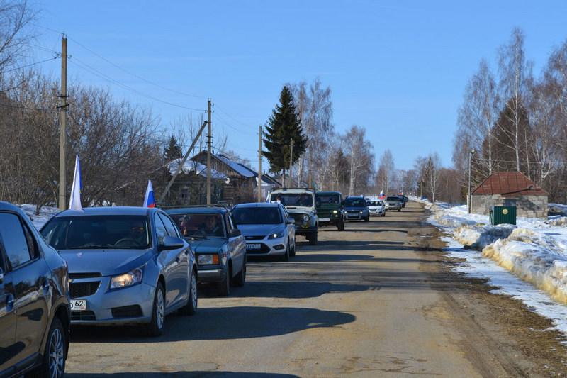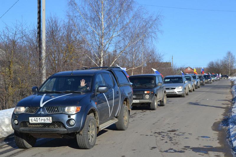 Колонна из более чем 40 автомобилей в 14.30 двинулась от здания районной администрации по улицам рабочего поселка Пителино, сел Пеньки, Потапьево, Нестерово. В селе Нестерово у памятника воинам, погибшим в годы Великой Отечественной войны, прошел митинг.